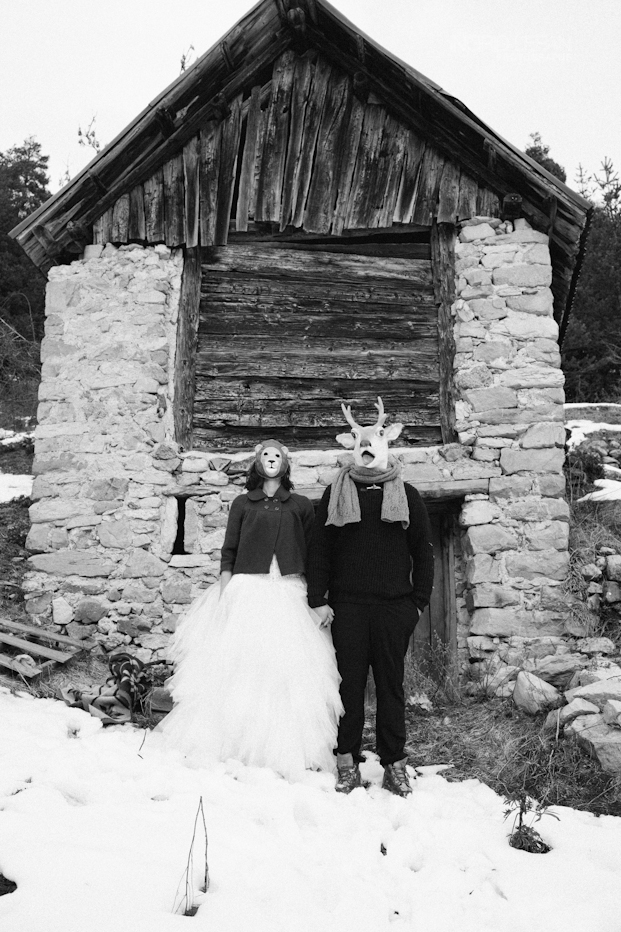 « Nous avions choisi de faire cela à la montagne et de jouer sur le côté « cottage » ! par contre j avoue que l’idée des masques est venue d’Ingrid ! Au début ça me semblait plutôt bizarre, mais Thierry m’a convaincu de la suivre sur cette piste originale en argumentant que l’on avait jamais été déçus par « ses délires » et ce qui fût une fois de plus le cas !!! »