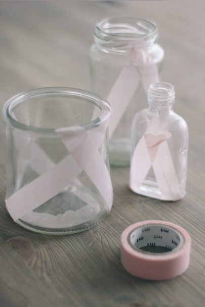 Des petits pots et des bouteilles en verre, quelques échantillons de peintures assorties (ici les nuances Nancy’s blush, Mole’s breath et St Giles Blue ), un pinceau, et du masking tape.