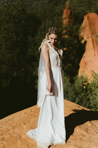 Camille nous en dit plus sur ses inspirations… »Pour ma seconde collection, j’ai souhaité insuffler un style folk, un style plus rustique à la future mariée de demain. La démarche de cette collection est de répondre aux mariées qui souhaitent sortir des sentiers battus, détourner la tendance bohème-chic qui est une case bien trop vaste à mon goût, pour un style plus affirmé : la combinaison entre des couleurs demi teintes et un retour au coton, une matière plus rustique, assure un parfait rendu pour un mariage folk en nature décoré de verdure et de macramé. J’ai voulu décliner la robe de mariée dans une nuance de off white, des dentelles de coton écrues , des crêpes de couleur crème pour casser avec la traditionnelle robe blanche. Le coton est le fil conducteur entre chaque modèle de cette collection.«