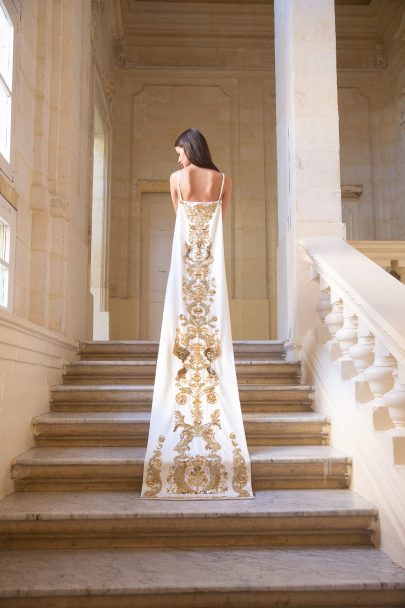 Ma première collection est inspirée par le magnifique château de Courances, avec son architecture ornementale et ses jardins mystiques, et par le travail unique de Jean Cocteau qui en était le voisin. Les références oniriques s’y reflètent notamment dans les formes très fluides. Les détails ornementaux très raffinés m’ont inspirée pour imaginer des broderies et des imprimés.