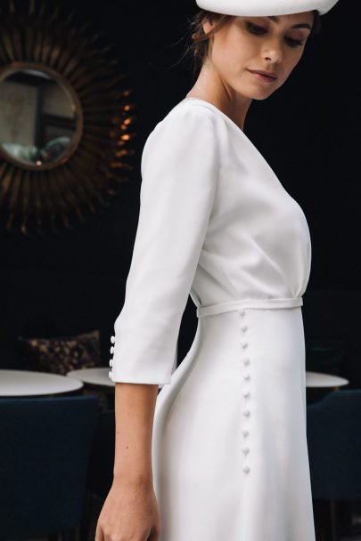 Il était une fois… serait un bon début pour décrire la collection 2020 de Mathilde Marie. Avec sa manière personnelle d’associer lignes rétro et détails contemporains, la créatrice dessine treize silhouettes, comme autant de personnages tout droit sortis d’un film ou d’un roman. Telles des héroïnes de leur propre histoire, élégante Dolores, romantique Adélie, douce Ysaé, pétillante Miléna… chaque robe est imaginée comme un récit où la mariée évolue dans les rues de Paris, puis se repose dans un bar aux accents art-déco.
