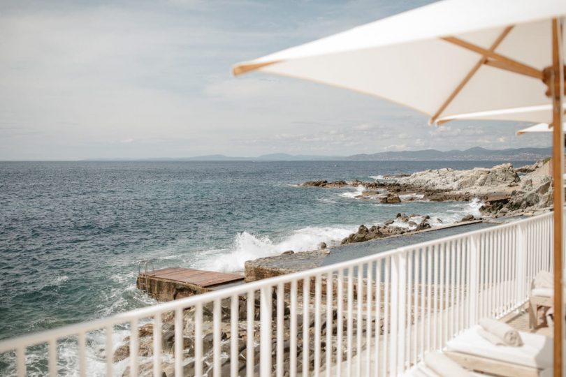 « Le lieu mythique de l’hôtel des Roches rouges à Saint Raphael s’est imposé naturellement pour cet édito. C’est une chance unique d’avoir eu ainsi accès à cet hôtel au luxe discret pendant toute une journée. Tout y est d’une extrême justesse aussi bien le choix des meubles que les aménagements extérieurs où la mer Méditerranée se fond dans les piscines creusées à même la roche. »