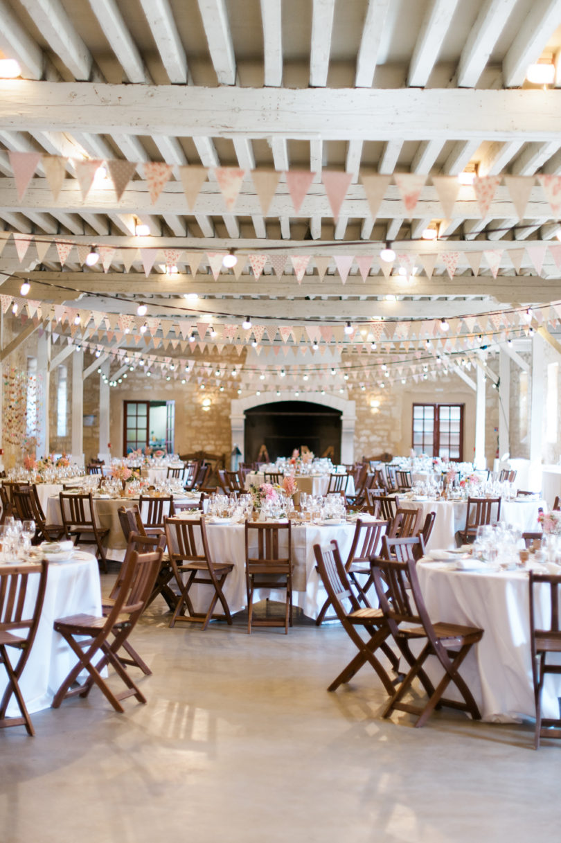 « Nous n’avions pas vraiment de thème mais un fil conducteur de douceur champêtre mêlée à un côté authentique et un peu brut: donc des matières comme le lin, le kraft, le bois, et des motifs Liberty dans des couleurs pastel. Je sais que ce thème « rustique chic » est un peu vu et revu mais c’était celui qui nous correspondait et nous plaisait donc pourquoi faire autre chose? De plus il allait très bien avec la salle qui était un mélange d’élégance brute et de sobriété (plafond blanc aux poutres apparentes, murs en pierre blonde de Bordeaux, sol en béton ciré gris clair, grosse cheminée). »